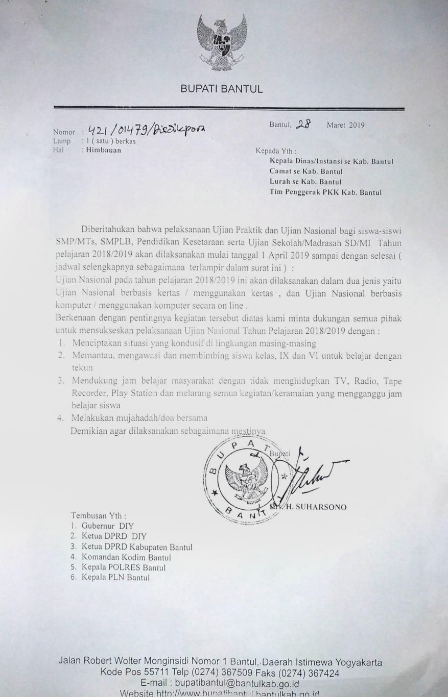 Himbauan Bupati Bantul Berkaitan Dengan Ujian Nasional dan Ujian Sekolah
