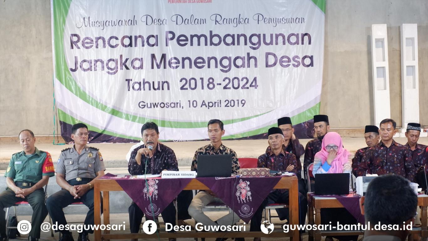 Untuk mengangkat potensi sumberdaya desa, serta rumusan tindakan strategis yang diorientasikan untuk memenuhi cita-cita peningkatan kesejahteraan dan membangun tata pemerintahan desa yang demokratis, adil dan terbuka (transparan). Pemerintah Desa Guwosari bersama seluruh elemement warga masyarakat mengadakan musyawarah desa dalam rangka menyusun Rancangan Pembangunan Desa Jangka Menengah Tahun 2018-2024 pada 10 April 2019 bertempat di GOR Desa Guwosari.